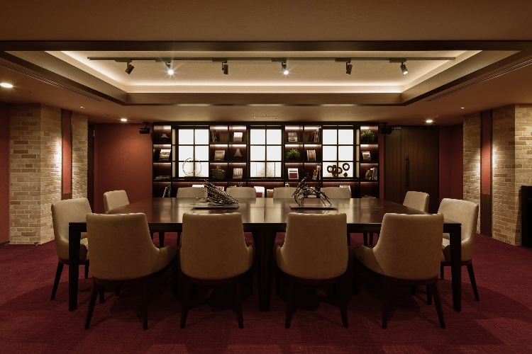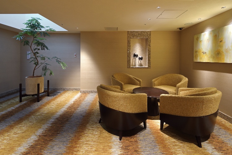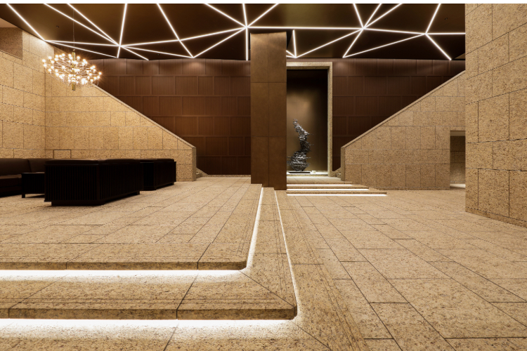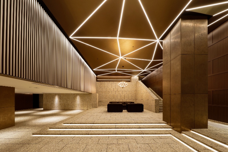 エントランスホールは奇をてらわない普遍的な美と、引き締まった雰囲気が感じられます。反射板のような天井とルーバーが使用されており、開放感のある二層吹き抜けの空間となっています。