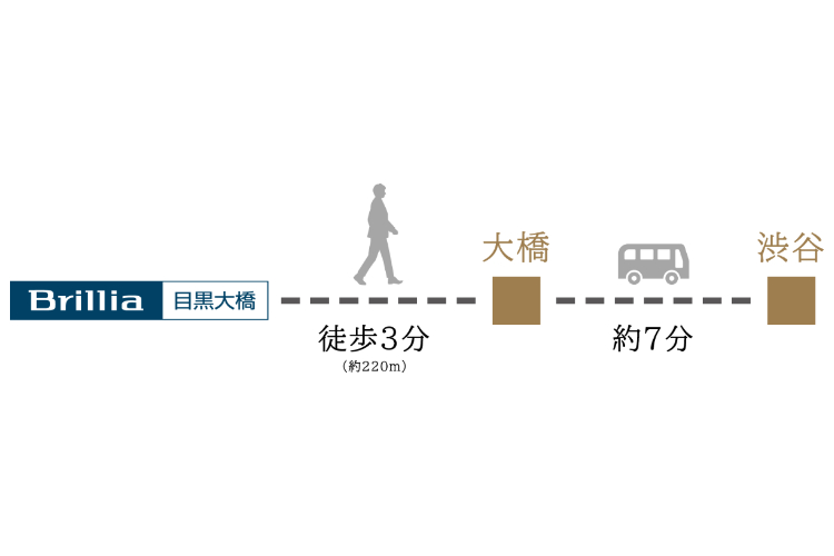 『ブリリア目黒大橋』は東急田園都市線 「池尻大橋」駅 まで徒歩5分、京王井の頭線「駒場東大前」駅まで徒歩12分の場所に位置しています。東急田園都市線は東京メトロ半蔵門線と相互直通運転を行っている路線のため、「渋谷」駅、「表参道」駅、「大手町」駅といった都心へもダイレクトにアクセスできます。