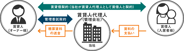 賃借人からの賃料は当社を経由し、当社手数料を差し引いた上、オーナー様にお支払いいたします。 ※空室時の賃料保証はありません。